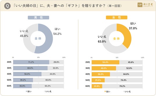 ◎「ギフトを贈る」と回答が男女間で17.2ポイント差になるなど、夫の方が妻にギフトを考える割合が高い結果に(男性:54.2%>女性:37.0%)◎男女ともに若い夫婦ほど「いい夫婦の日」にギフトを贈る傾向となり、最多回答は20代男性で7割(71.2%)