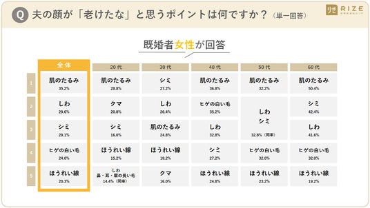 6.【夫の顔が「老けたな」と思うポイントTOP5】1.肌のたるみ 2.しわ 3.シミ 4.ヒゲの白い毛 5.ほうれい線