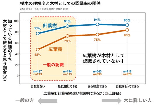 本事業の一環として、広葉樹の加工・流通に携わる木材事業者から、需要者である設計士・デザイナー、最終消費者となる一般企業までを対象としたアンケート調査を実施し、計811件の回答を得ました。当社は本アンケート調査の解析を担当し、各ステークホルダーの利用実態や課題を整理するとともに、今後の利用拡大に向けた施策の分析を行いました。