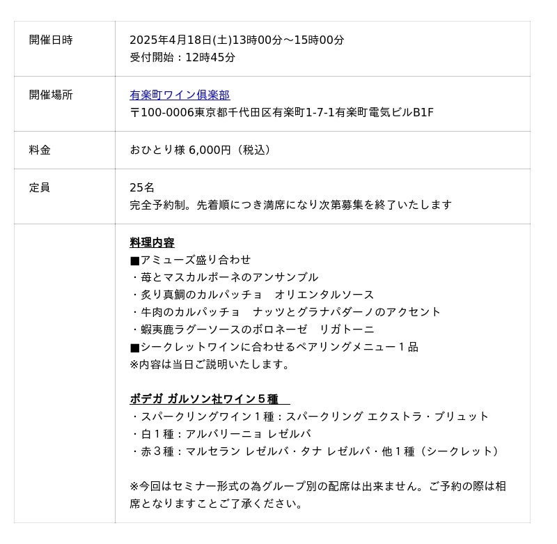 『有楽町ワイン倶楽部』はワインにピッタリの小皿料理やビストロ料理を気軽にお愉しみいただけるビストロバルです。「もっとワインを楽しんでもらいたい。」「ワインを通して新しい価値を体験してもらいたい。」ワインをサーブするだけではなく、愉しい時間とともにお客様の記憶に残るような“体験”を届ける。このイベントを通じてワインを飲み続けていただくお客様との絆をつくっていきたい。そんな想いで不定期とはなりますがワインイベントを開催しております。