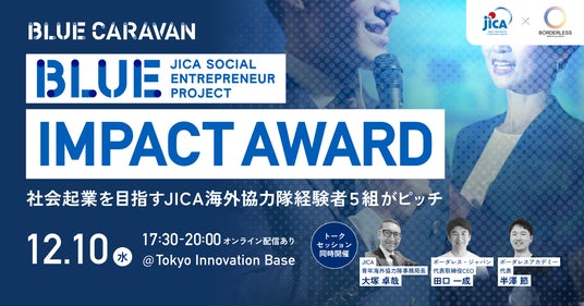 その一環として始動する「JICA BLUE CARAVAN」は、日本全国を巡り、国際協力の現場で培った知見や志を社会起業へとつなぐ挑戦を発信するリアルイベントです。初回となる東京開催では、12月10日(水)にTokyo Innovation Base(有楽町)にて、5組のJICA海外協力隊経験者によるピッチコンテスト「JICA BLUE Impact Award」を実施します。