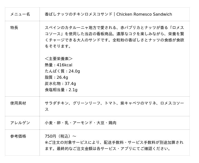 メインとなるサンドウィッチのメニューは7種類。スペインのカタルーニャ地方で愛される、赤パプリカとナッツが香る「ロメスコソース」を使用した看板商品となる「香ばしナッツのチキンロメスコサンド」、全粒粉の香ばしさと溢れ出す肉の旨みを存分に味わえる「ローストポークジンジャーサンド」や、卵を贅沢に2個半も使用した卵好きにはたまらない「ダブルエッグサンド」など、個性豊かな7つのサンドウィッチメニューをお好みやシーン応じてお楽しみいただけます。