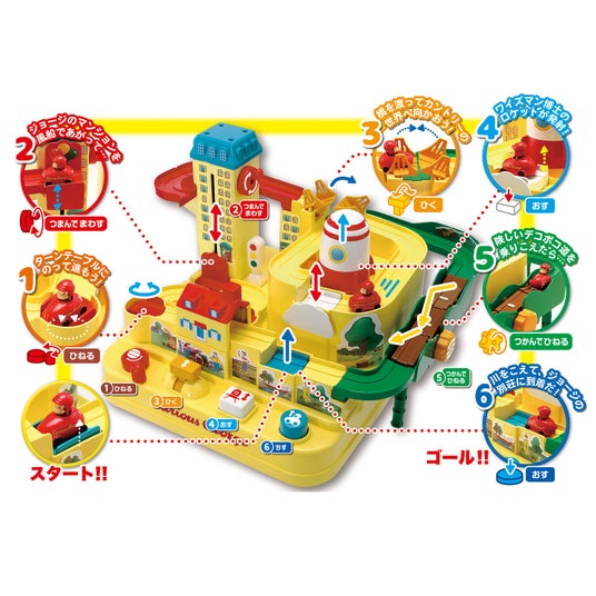 スイッチの順番や仕組みを試しながら、ジョージを目的地に導く遊びへ成長し、自分で考えて動かすことで、集中力や段取り力が育まれます。