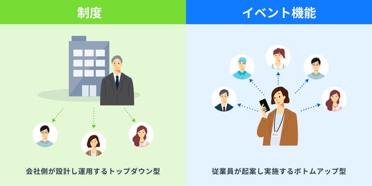 今回の「イベント機能」は、組織が設計した「制度」の枠組みを従業員が超えて、自ら「つながり」を創り出すための機能です。