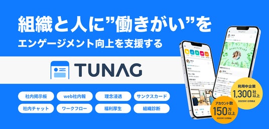 TUNAG(ツナグ)は、組織の生産性向上や離職率の低下を目的とし、社内コミュニケーションと情報共有を促進する統合型プラットフォームです。2025年12月時点で、利用中企業数は1,300社、利用ユーザー数は150万人を突破しています。