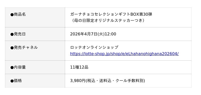 株式会社ロッテ(東京都新宿区、代表取締役社長執行役員:中島英樹、以下ロッテ)は4月7日(火)12:00より、ロッテオンラインショップ限定で「ガーナチョコセレクションギフトBOX第30弾(母の日限定オリジナルステッカーつき)」を販売します。母の日限定のオリジナルステッカーは、あの大人気TVアニメ『ONE PIECE』のキャラクターを使用した母の日限定のオリジナルデザイン。キャラクターたちが贈る心温まるメッセージにもご注目ください。1,500セットの数量限定販売となります。今年の母の日は、「ガーナチョコレート」と『ONE PIECE』の仲間たちと一緒に、感謝のきもちを届けてみませんか?