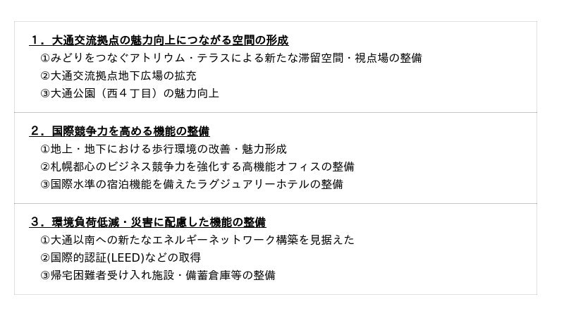 当社は、グループ長期ビジョン「WAY 2040」において、成長戦略の一つとして「再開発事業の拡大 ~人々を惹きつける場づくりの全国展開~」を掲げ、札幌再開発を推進しております。当社史上最大規模の再開発プロジェクトとなる「大通西4南地区第一種市街地再開発事業」の推進をはじめとし、札幌においても人々を惹きつける場づくりを展開することにより、札幌の都市競争力の強化に貢献します。SDGs(持続可能な開発目標)への取り組み