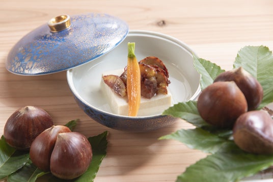 群馬県産栗と姫人参を添えたなめらかな胡麻豆腐。出汁ではなく群馬県産牛乳で仕上げ、渋皮煮には赤ワインを加えた濃厚な味わいに。