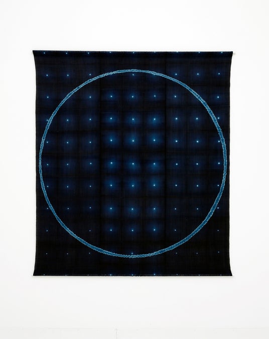 「交差する青 -1」 亜麻 220×200cm(撮影:来田 猛 Koroda Takeru)