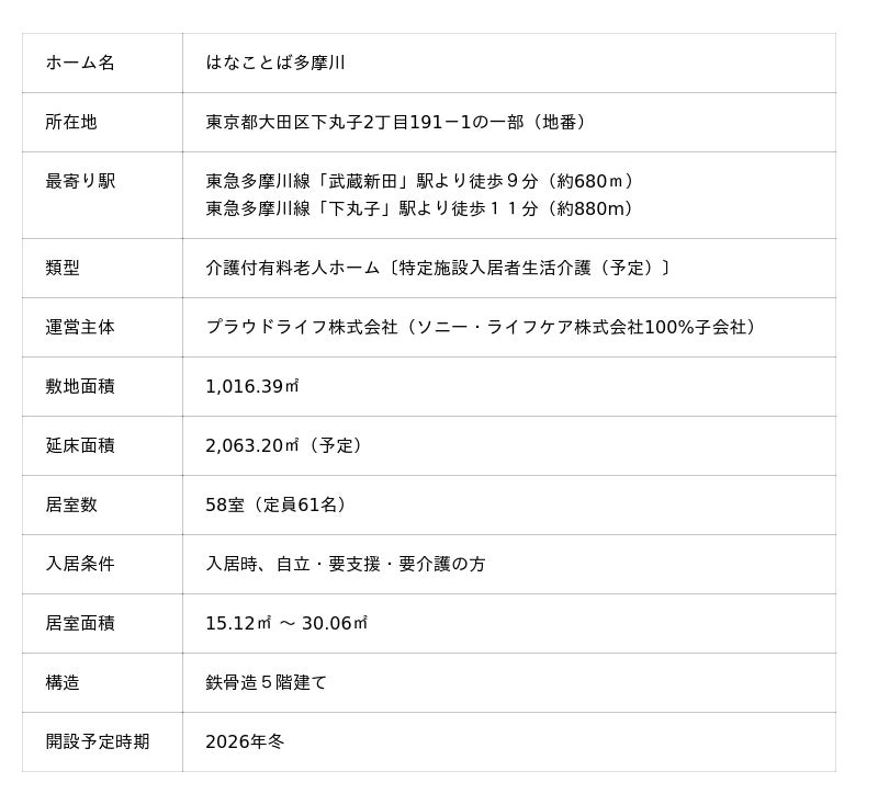 ソニー・ライフケアグループの一員であるプラウドライフ株式会社(本社:神奈川県川崎市、代表取締役社長 峰山 正樹)は、2026 年冬に、東京都大田区において介護付有料老人ホームを開設することとなりましたので、下記の通りお知らせいたします。