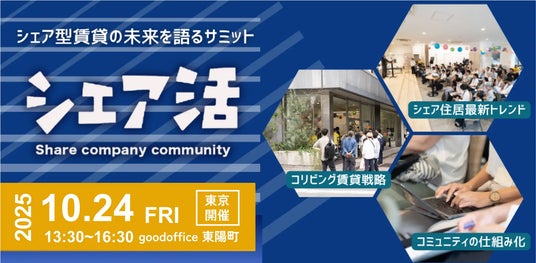 全国にコミュニティ特化型のシェアハウスを展開する株式会社絆家(代表:平岡雅史)は、株式会社シェア180(代表:伊藤正樹)、グッドルーム株式会社(代表:小倉弘之)と共同で、シェア型賃貸(シェアハウス・コリビング)に特化した事業者向け合同サミット「シェア活2025」を、2025年10月24日(金)に「goodoffice 東陽町」(東京都江東区)にて開催いたします。