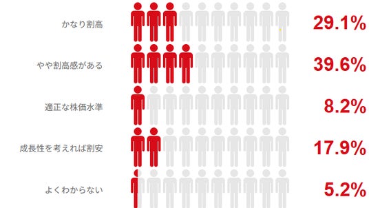 約7割の人が「割高」と答え、警戒感を持っていることが分かった。裏返せばこの上昇相場に乗れていない人が多いのだろう。東京市場では少数のAI関連銘柄に買いが集中し、PERが釣り上がっている。AIの大本命である米エヌビディアをPERで大幅に上回る銘柄も散見され、そうした銘柄は明らかに割高なのではないか。