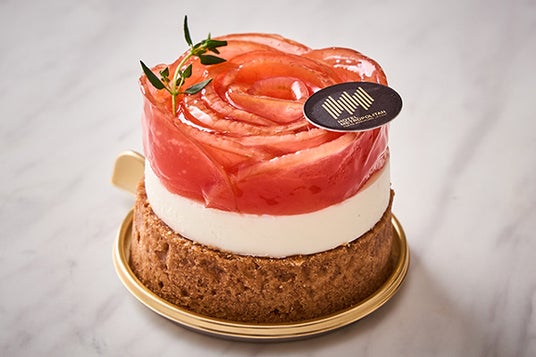 旬のりんごを赤ワインで煮て、深みのある上品な味わいのコンポートにしました。鮮やかな赤色に染まったりんごは、バラに見立てて飾り付けたエレガントな一品です。ほのかなりんご風味のクリームチーズの中には、スモモの一種である“ミラベル”のゼリーを入れ、優しい甘さを加えました。土台のチョコレートタルトにもりんごのコンポートを交ぜて焼き上げており、存分に旬のりんごの味をご堪能いただけます。