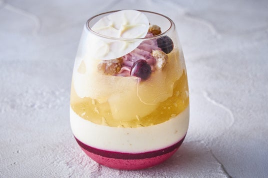 洋梨のコンポートとムース、カシスのゼリーとムースが層になった季節のヴェリーヌです。白ワインでコンポートした洋梨の豊かな香りと優しい甘みがより際立つよう、カシスのシャープな酸味をプラスしました。透明なグラスの中で美しく彩られ、繊細に飾り付けた見た目もお楽しみください。