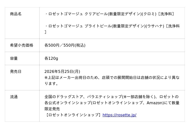 ロゼット株式会社(本社:東京都品川区、代表取締役社長:藤井敬二)は、ロングセラー角質ケアブランド『ロゼットゴマージュ』から、一昨年、昨年に引き続き株式会社サンリオの大人気キャラクターとコラボレーションしたオリジナルデザインの「ロゼットゴマージュ クリアピール」「ロゼットゴマージュ ブライトピール」を数量限定で発売いたします。今回は「クロミ」「ウサハナ」のパッケージで登場。2026年5月25日(月)より全国のドラッグストア、バラエティショップ(※一部店舗を除く)、ロゼットの各公式オンラインショップにて発売いたします。
