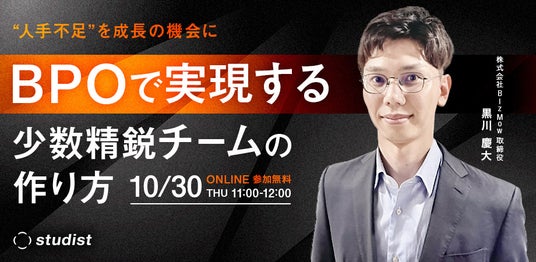 企業のオペレーション改革を支援する株式会社スタディスト(本社:東京都千代田区、代表取締役CEO:鈴木悟史、以下「スタディスト」)は、2025年10月30日(木)に、BPO(ビジネスプロセス・アウトソーシング)を活用した少数精鋭チームの構築方法を解説するオンラインセミナーを開催します。労働力不足が深刻化する中、限られた人材で最大の成果を生み出す新しい組織運営の手法を、事例とともにご紹介します。