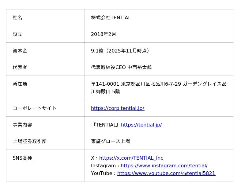 株式会社TENTIALは、「健康に前向きな社会を創り、人類のポテンシャルを引き出す。」をミッションに掲げ、コンディショニングブランド『TENTIAL』を運営しています 。代表取締役CEO中西裕太郎は、プロサッカー選手を目指した高校時代に病気で夢を絶たれた原体験から、自身のポテンシャルを最大限に発揮するためには健康と日々のコンディショニングが不可欠であると痛感。この経験から株式会社TENTIALを創業し、世の中に「コンディショニングを実装する」ことを目指しています。コンディショニングブランド『TENTIAL』は、アスリートの知見と最新技術・研究に基づき、機能性を追求した製品・サービスを提供。24時間365日、日常生活のあらゆるシーンで心身を整え、疲労回復やパフォーマンス向上をサポートするコンディショニング活動を推進しています 。すべては個人のコンディションとポテンシャルを引き出すという信念のもと、株式会社TENTIALは、健康に前向きな社会の実現のため、コンディショニングの社会実装に取り組んでまいります。
