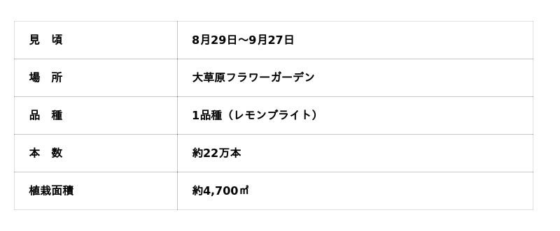 国営ひたち海浜公園の「大草原フラワーガーデン」では、鮮やかな黄色い花を咲かせるキバナコスモス“レモンブライト”が、8月29日から見頃を迎えています。澄んだ青空に映える鮮やかなレモンイエローの花々が一面に広がる様子は、来園者を夏から秋へと誘います。“レモンブライト”の見頃は、9月下旬頃まで続く見込みです。