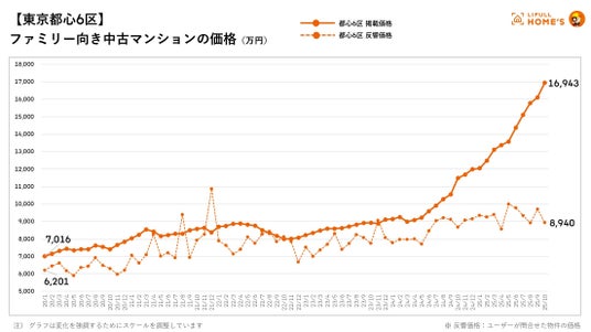 ファミリー向き中古マンションの平均掲載価格は、東京23区で1億429万円(前年同月比145.3%)、東京都下で3,516万円(前年同月比109.1%)となり、計測開始以降の過去最高価格を更新しました。東京都心6区(千代田区、港区、中央区、新宿区、渋谷区、文京区)では1億6,940万円(前年同月比147.6%)と特に高い上昇率となっており、東京都内の平均価格上昇を牽引しています。