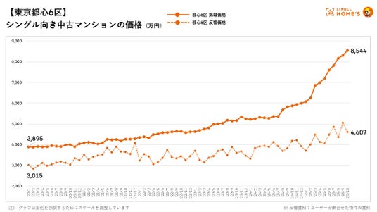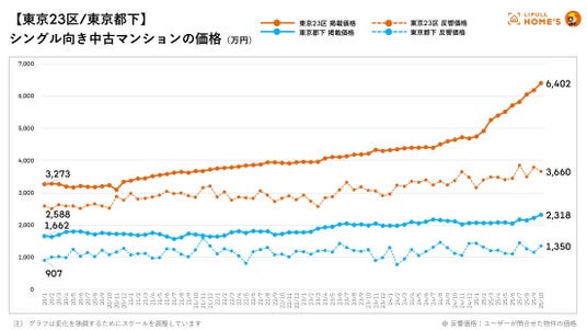 シングル向き中古マンションの平均掲載価格は、東京23区で6,402万円(前年同月比137.8%)、東京都下で2,318万円(前年同月比109.7%)となり、計測開始以降の過去最高価格を更新しました。東京都心6区(千代田区、港区、中央区、新宿区、渋谷区、文京区)では8,544万円(前年同月比145.5%)となり、計測開始以降の過去最高価格を更新しました。