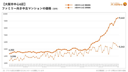 ファミリー向き・大阪市中心6区で最高掲載価格を更新し9,400万円台、前年同月比150%の上昇に。