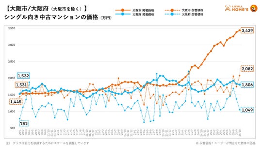 シングル向き中古マンションの平均掲載価格は、大阪市で3,439万円(前年同月比142.4%)となり、5ヶ月連続で過去最高価格を更新しました。大阪市を除く大阪府で1,806万円(前年同月比111.4%、前月比98.6%)と2ヶ月連続で下降しています。