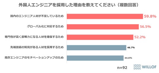 また、「外国人エンジニアを採用したことがある」と回答した人を対象に、【外国人エンジニアを採用した理由(複数回答)】について聞いたところ、「国内のエンジニア人材が不足しているため」が59.8%で最も多い結果となりました。次いで「グローバル化に対応するため」が56.5%、「専門性が高く即戦力になる人材を確保するため」が52.2%という結果でした。
