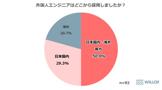 そのほかにも、【外国人エンジニアの採用元】について聞いたところ、50.0%が「日本国内・海外の両方から採用している」と回答しました。日本国内だけではなく海外からの採用も多いことがわかりました。