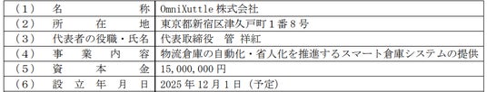また、Mordor Intelligence社の調査(※)によると、無人搬送機(AGV)市場は2029年までに年平均成長率(CAGR)8.29%で拡大すると予測されており、グローバルにおいても物流自動化分野は今後さらに大きな成長が見込まれています。当社は、これまで培ってきた IT・DX 領域での実績と日本国内でのサポート体制を活かし、中国・上海に本社を構える自動倉庫ソリューションのリーディングカンパニーである上海 GLOBL智能科技株式会社との協業により、コストパフォーマンスに優れた自動化製品・サービスを、安心してご導入いただけるように準備を進めてまいりましたが、これをさらに推進するため、上海 GLOBL 智能科技株式会社が属する中国・GLOBL グループのシンガポール法人である新加坡赢宝智能科技私人有限公司と共同で OmniXuttle株式会社を設立します。