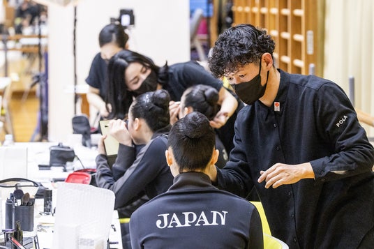 新体操日本代表「フェアリー ジャパン POLA」のビューティーサポート活動を担う美のエキスパート「美容コーチ」として現在8名が活動しています。毎年、演技や衣装、選手の希望に合わせたメークパターンを考案し、選手一人ひとりの顔立ちにあったメークを指導。また、肌のチェックからスキンケアアドバイスなどをサポートすることで、選手たちに寄り添い、選手団の一員として共に戦っています。