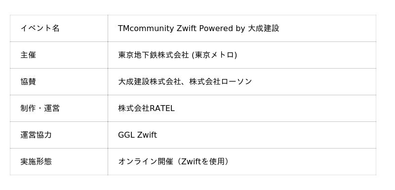 株式会社RATEL(本社:東京都渋谷区、代表取締役:吉本 砂月、以下「RATEL」)は、東京地下鉄株式会社(本社:東京都台東区、代表取締役社長:小坂 彰洋)が主催するオンラインイベント 「TMcommunity Zwift Powered by 大成建設」 において、大会の制作・運営を担当することをお知らせいたします。