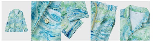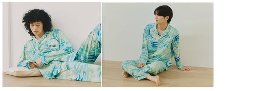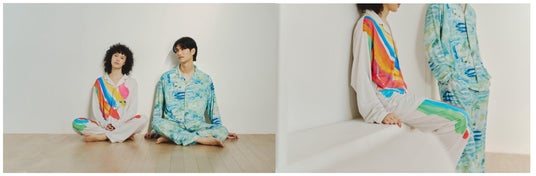 「BAKUNE Pajamas Dry(HERALBONY)」は、リカバリーウェア「BAKUNE」に、ヘラルボニーの契約作家2名の作品がそれぞれ描かれた2種類展開となっており、まさに着用できるアート作品として、身に纏う方の心身にやすらぎの提供を目指します。