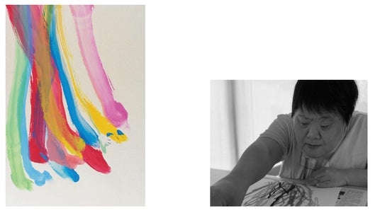 笹山の制作は、スタッフが声を掛けることではじまる。「どうぞ」という一言をきっかけに、彼女は伸びやかに筆を走らせていく。力強い丸や、色とりどりな線。一本一本丁寧に、ぐっと力を込めて、机を覆うように着席した彼女の胸元から外側に向けて線は引かれる。多くの作品は、筆跡が紙からはみ出ており、彼女の力強さとおおらかさが表れている。