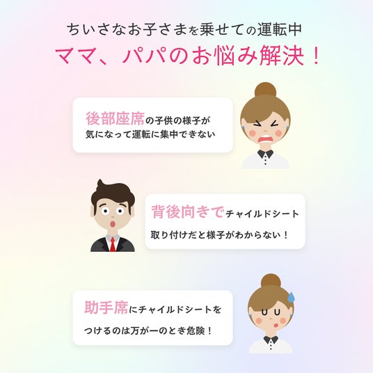 ちいさなお子様を乗せての運転中のおなやみを解決!後部座席のお子様の様子が気になる親御さんは多くいらっしゃいます。特にお子様が小さいと、ちゃんとチャイルドシートにいてくれているか、バックミラーでは確認できず運転に集中できないことも・・・