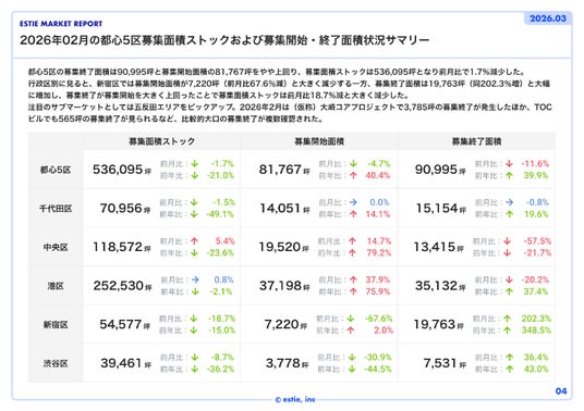 日本最大級の商業用不動産データ分析基盤「estie マーケット調査」を中心に複数のサービスを提供する株式会社estie(本社:東京都港区、代表取締役:平井 瑛、以下「estie」)は、「estie マーケット調査」による分析データをまとめた最新不動産マーケット動向レポート「エスティ マーケットレポート」2026年3月号を配信開始しました。