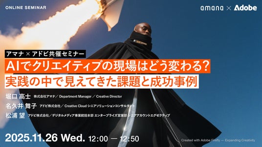 コミュニケーション変革をクリエイティブで実現する株式会社アマナ(本社:東京都品川区、代表取締役社長:金子剛章、以下「アマナ」)は、アドビ株式会社と共同で、2025年11月26日(水)、「AIでクリエイティブの現場はどう変わる?実践の中で見えてきた課題と成功事例」をテーマにオンラインセミナーを開催します。