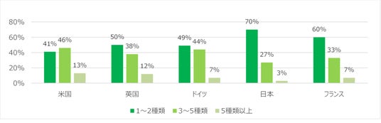 「日常的にAIツールを利用する」は米国(82%)、英国(86%)、ドイツ(88%)、フランス(78%)、日本(73%)となり、AIの利用率において日本が最も低い結果となりました。また、日本のAI利用者の70%が週に「1~2種類」のツールしか使用しておらず、これは他国(41%~60%)を大きく上回ります。一方で、週に5種類以上のツールを使いこなす「パワーユーザー」はわずか3%で、5カ国中最低でした。これは、個人が自由にツールを試すのではなく、企業が特定のツールを統一的に導入している「トップダウン型」の導入モデルを示唆しています。