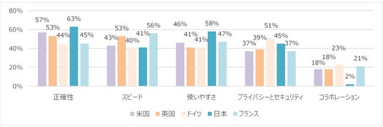 日本の回答者は、AIツールに求める特徴として「正確性」(63%)と並び、「使いやすさ」(58%)を極めて高く評価しました。この数値は、米国、英国、ドイツを上回っており、直感的でシンプルな操作性が日本の市場では不可欠であることを示しています。