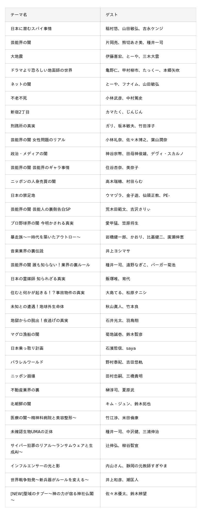 今回のテーマは「聖域のタブー~神の力が宿る神社仏閣~」。これまで1万5,000社以上の神社を巡った神社ソムリエの佐々木優太さんと、現役住職でありYouTubeでも仏教の教えをもとにした情報を発信している鈴木辨望さんをゲストに招き、意外と知らない神社やお寺の知識・歴史に加え、後継者問題や海外資本によるお寺・葬儀場の買収といった、日本の文化の根幹を揺るがす問題について語っています。ぜひ番組をご覧ください。