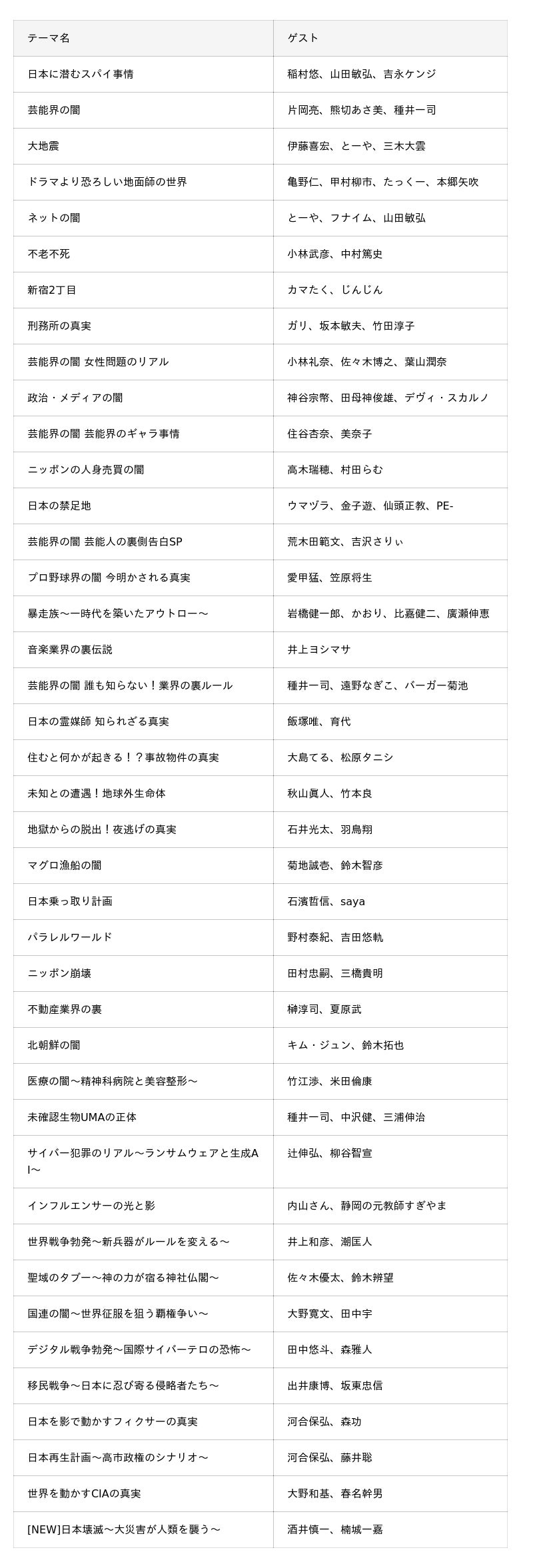 今回のテーマは「日本壊滅~大災害が人類を襲う~」。地震をはじめとする自然災害の専門家である酒井慎一さんと楠城一嘉さんをゲストに招き、富士山噴火、南海トラフ地震、首都直下地震に関する最新の科学的見解とリスク予測について、地震研究の最前線に立つお二人とともに科学的データをもって解説します。ぜひ番組をご覧ください。
