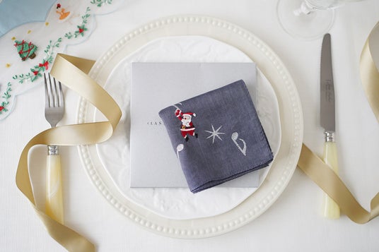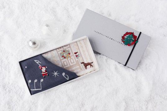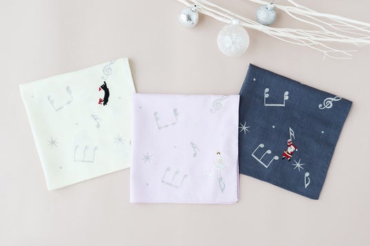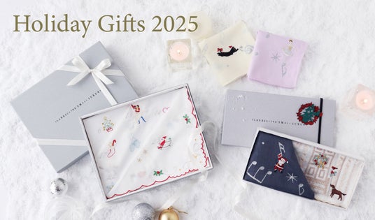 モチーフにはリースやサンタクロースなど、ホリデーならではのワクワク感や楽しさを表現し、色やデザインには大人の心がときめく上品さを添えました。自分へのごほうびはもちろん、気軽なギフトから特別なひと品まで。さまざまなシーンに寄り添う、心華やぐハンカチーフコレクションです。