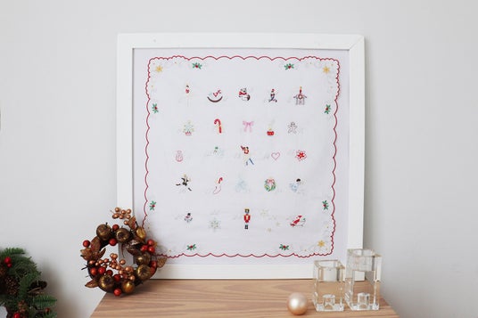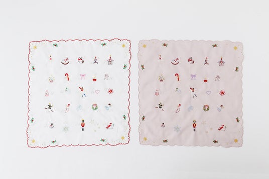 クリスマスまでの期間を楽しみながらカウントダウンするカレンダーをハンカチーフで作りました。一日ずつ、リースやサンタクロースなど、この季節ならではのモチーフを繊細に刺繍で表現しました。