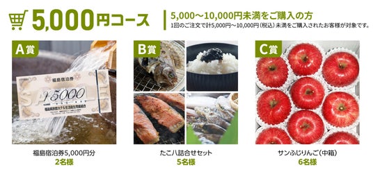 ふくしま市場で、キャンペーン期間中に一度のご購入が計3,000円/5,000円/10,000円以上の方に、当店よりお送りする該当コースの応募フォームからご応募ください。