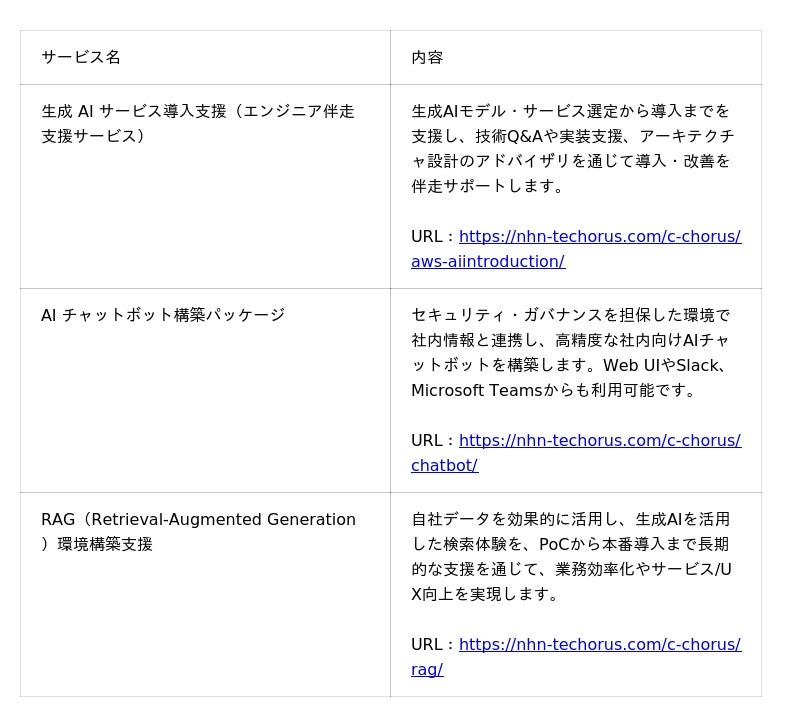 NHN テコラス株式会社(本社:東京都港区、代表取締役社長:白倉章照、以下:NHN テコラス)は、アマゾン ウェブ サービス(以下:AWS)を活用した企業の生成 AI 活用を促進する支援サービスとして、新たに「社内 AI チャットボット基盤導入」「RAG(検索拡張生成)環境構築」「生成 AI 業務組み込みの伴走支援」の提供を開始しました。