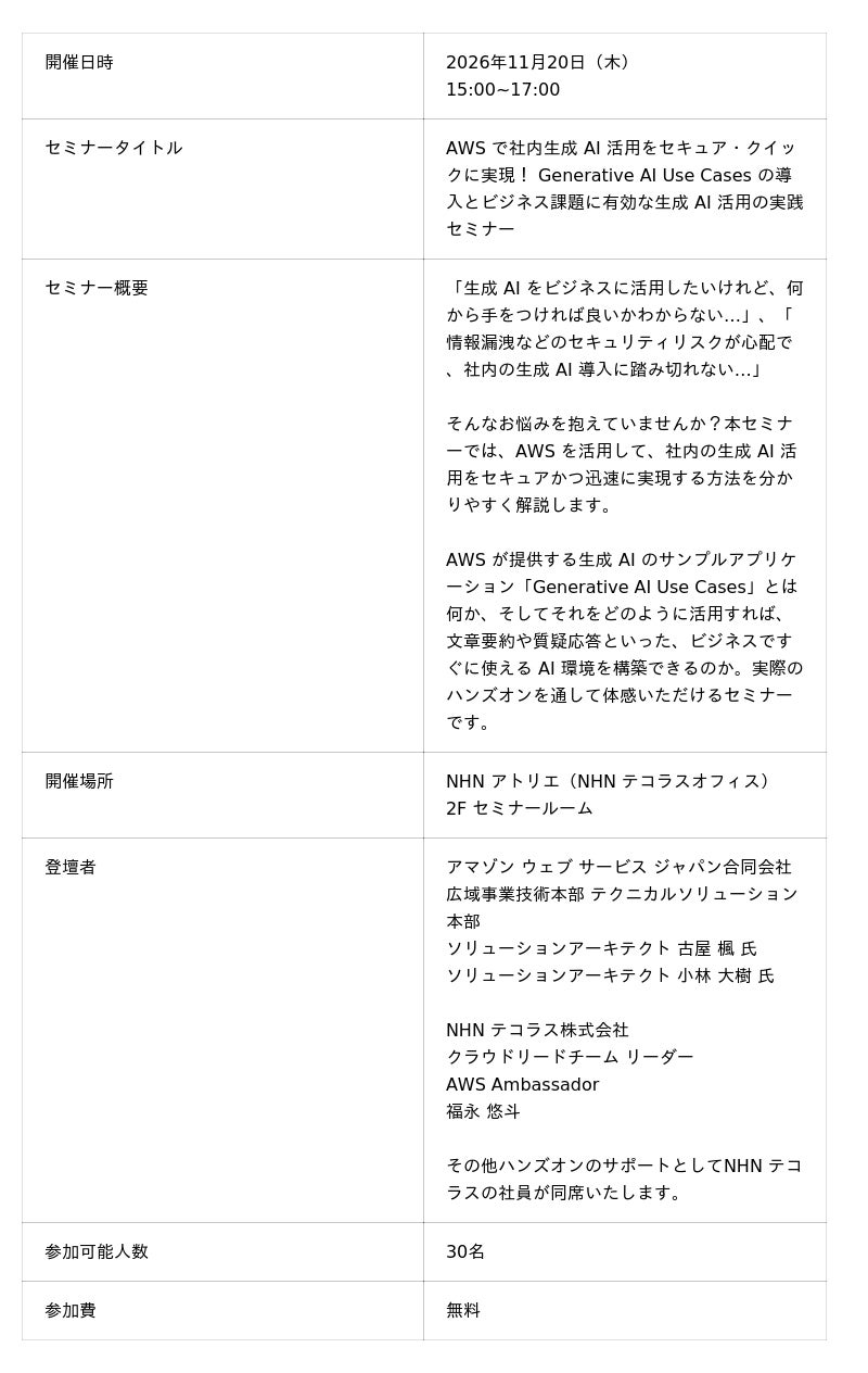 2025年11月20日(木)には、AWSジャパン社員登壇による生成 AI アプリケーション「Generative AI Use Cases(GenU)」の活用方法についての実践ハンズオンセミナーを無料開催します。