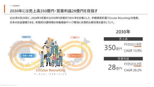 2025年8月28日に、2026年9月期から2030年9月期までの5ヶ年を対象とした、中期経営計画『Circular Recruiting』を発表しました。日本の社会課題である、年間約50億時間の労働需給ギャップ解消に圧倒的な解決策を提示していきます。