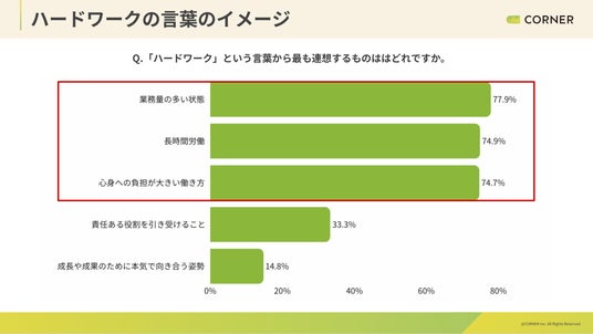 「ハードワーク」という言葉から連想するイメージは、「長時間労働・過重な負荷」といった否定的な意味が多数を占め、言葉自体がネガティブな文脈で受け止められている実態が明らかになっている。一方で、「責任を引き受ける姿勢」「成長のための努力」といった前向きな意味合いで捉える層も一定数存在しており、同じ言葉でも受け止め方が分断されている。