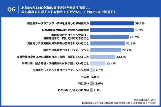 「Q6. あなたがLLMO対策の支援会社を選定する際に、最も重視するポイントを教えてください。(上位3つまで回答可)」(n=329)と質問したところ、「第三者データやファクト情報を活用した戦略提案力」が39.5%、「自社の業界やBtoBの商習慣への理解度」が39.2%、「戦略設計からコンテンツ制作・情報発信まで一貫して対応できること」が34.7%という回答となりました。