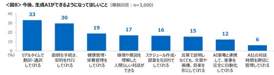 今後は、生成AIができるようになってほしいことに「リアルタイムで翻訳・通訳してくれる」「面倒な手続き、契約を代行してくれる」が3割台であがった。<図8>