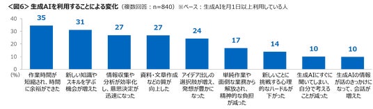 生成AIを利用することによって「作業時間が短縮され、時間に余裕ができた」「新しい知識やスキルを学ぶ機会が増えた」などポジティブにとらえている人が多かった。<図6>